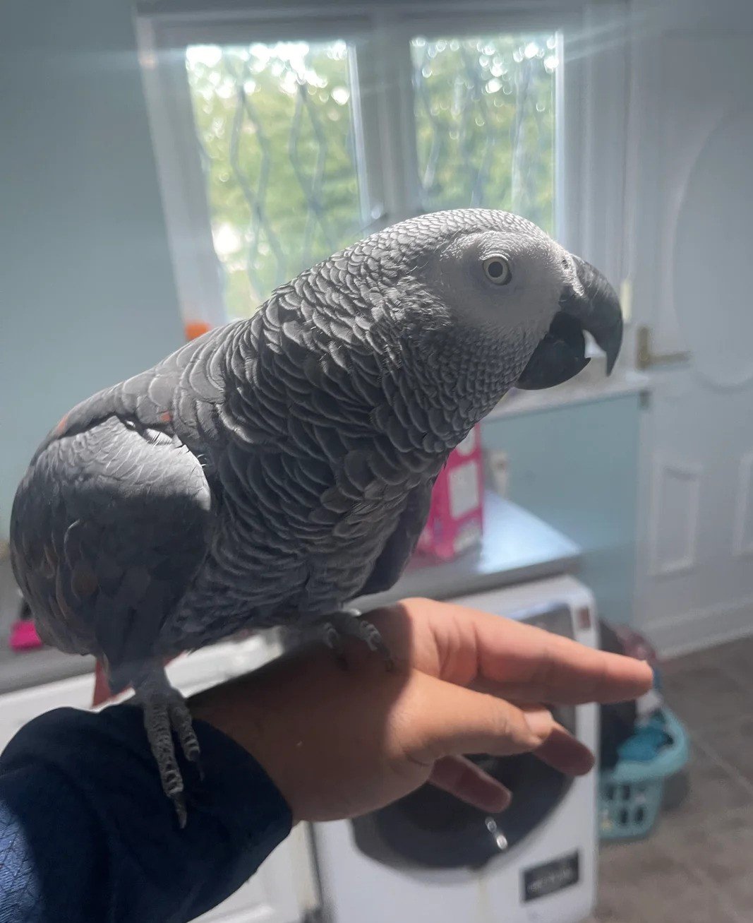 Congo African Grey parrots like Dolly require daily mental stimulation, social interaction, and a balanced diet. Toys, perches, and puzzle feeders keep them engaged, while regular interaction ensures they remain friendly and happy. Dolly is accustomed to human attention and is ready to bond with his new owner.
